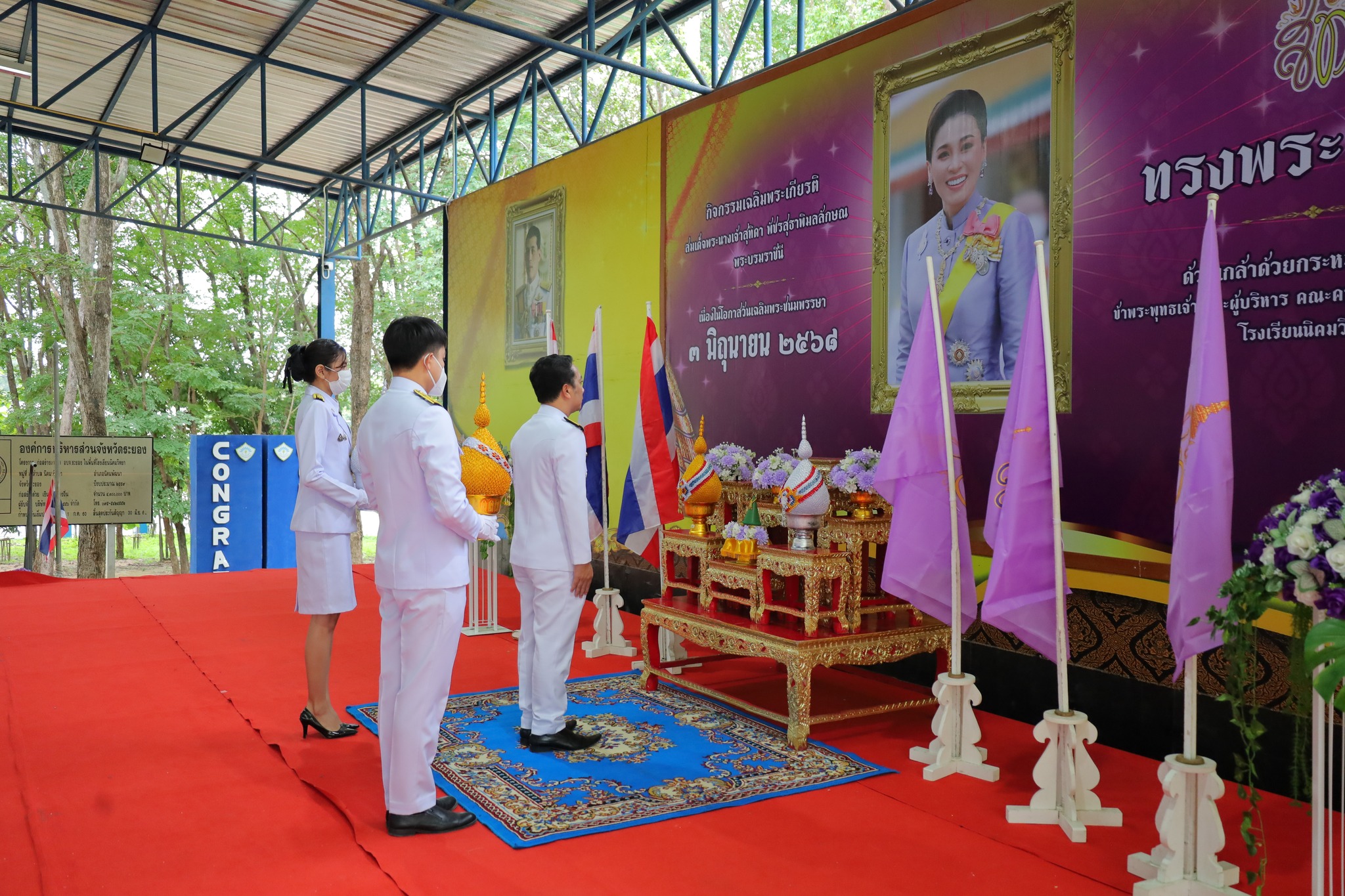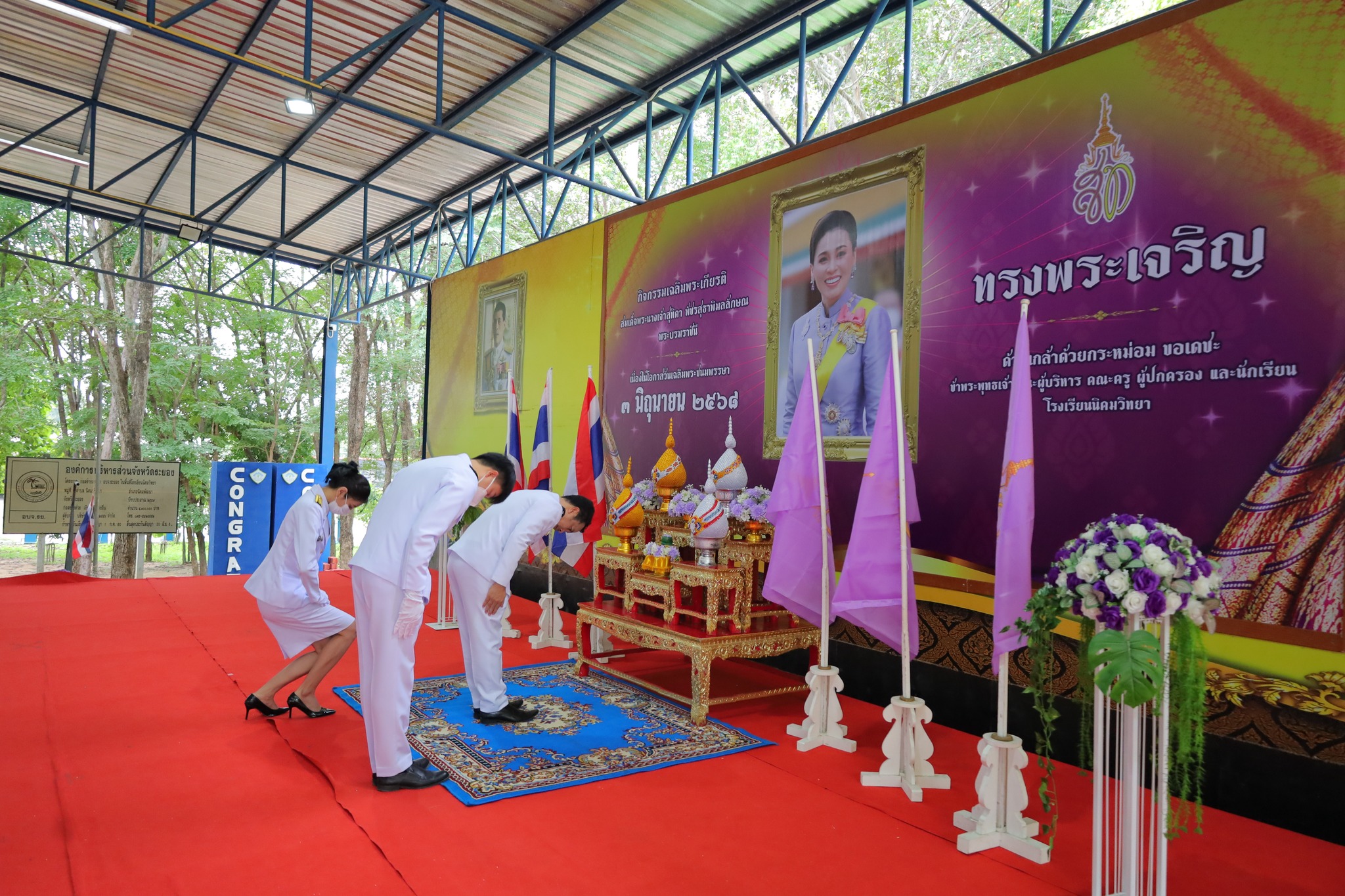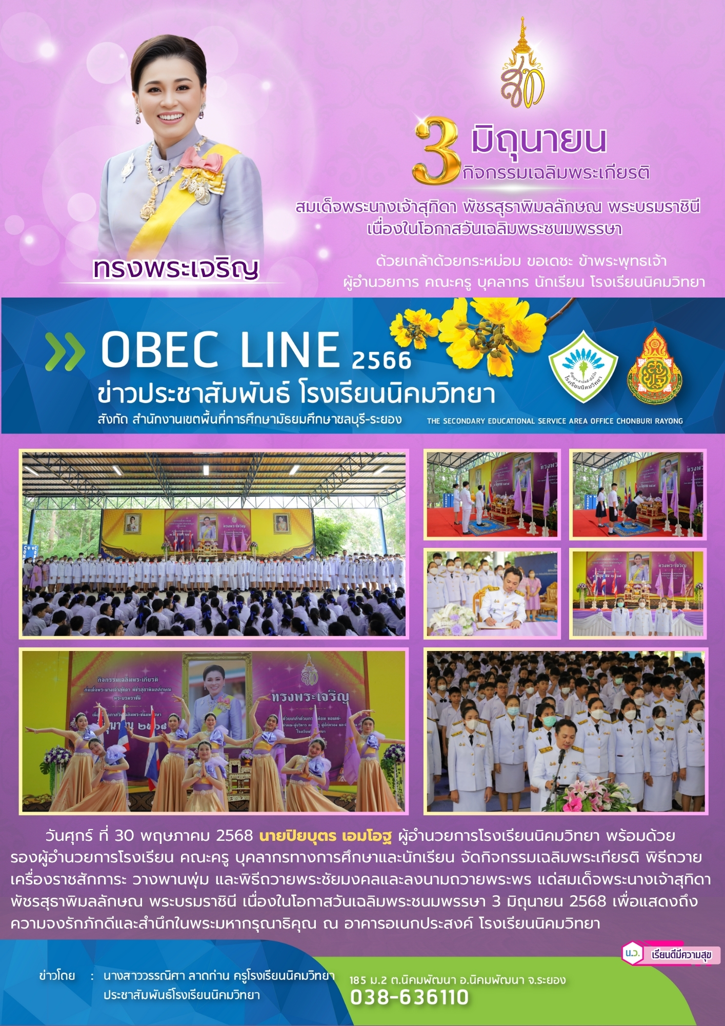 วันศุกร์ ที่ 30 พฤษภาคม 2568 นายปิยบุตร เอมโอฐ ผู้อำนวยการโรงเรียนนิคมวิทยา พร้อมด้วยรองผู้อำนวยการโรงเรียน คณะครู บุคลากรทางการศึกษาและนักเรียน จัดกิจกรรมเฉลิมพระเกียรติ พิธีถวายเครื่องราชสักการะ วางพานพุ่ม และพิธีถวายพระชัยมงคลและลงนามถวายพระพร แด่สมเด็จพระนางเจ้าสุทิดา พัชรสุธาพิมลลักษณ พระบรมราชินี เนื่องในโอกาสวันเฉลิมพระชนมพรรษา 3 มิถุนายน 2568 เพื่อแสดงถึงความจงรักภักดีและสำนึกในพระมหากรุณาธิคุณ ณ อาคารอเนกประสงค์ โรงเรียนนิคมวิทยา