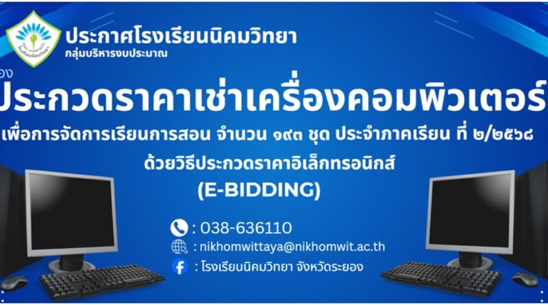 ประกาศโรงเรียนนิคมวิทยา เรื่อง ประกวดราคาเช่าเครื่องคอมพิวเตอร์เพื่อการจัดการเรียนการสอน จำนวน ๑๙๓ ชุด ประจำภาคเรียน ที่ ๒/๒๕๖๘ ด้วยวิธีประกวดราคาอิเล็กทรอนิกส์ (e-bidding)