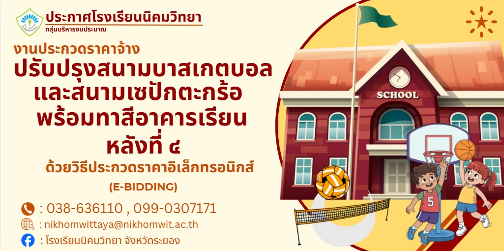 ประกาศโรงเรียนนิคมวิทยาเรื่องงานประกวดราคาจ้างปรับปรุงสนามบาสเกตบอลและสนามเซปักตะกร้อพร้อมทาสีอาคารเรียน หลังที่ ๔ ด้วยวิธีประกวดราคาอิเล็กทรอนิกส์ (E-BIDDING)