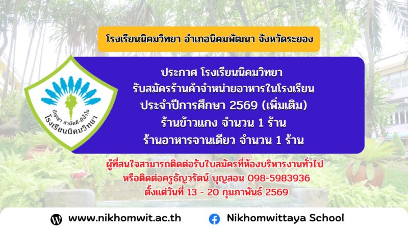 ประกาศ โรงเรียนนิคมวิทยารับสมัครร้านค้าจำหน่ายอาหารในโรงเรียนประจำปีการศึกษา 2569 (เพิ่มเติม)